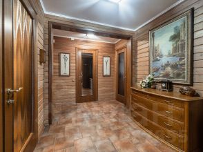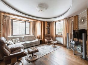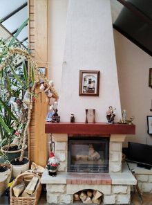 1-й этаж: застекленная терраса-9 кв.м, прихожия-4 кв.м, холл-10 кв.м, кухня-гостинная-40 кв.м, гостевая комная-12.7 кв.м, просторный санузел-7.3 кв.м, гардеробная-6 кв.м, зимний сад с дровяным камином-10 кв.м., установлены кондиционеры.