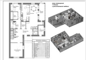 1 этаж — кухня-гостиная с выходом на веранду, жилая комната, гардеробная, кладовая, санузел, сауна, комната отдыха с выходом на задний двор.