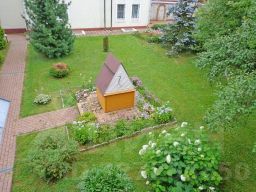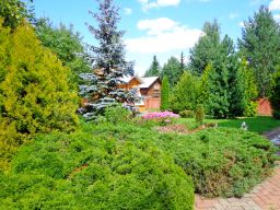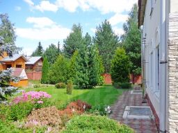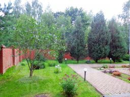 На ухоженном участке 20 соток посажены садовые и декоративные деревья (кедр, голубая ель, туи, яблони, слива) и кусты, пострижен газон, выложены дорожки и площадка на 3 м/места, проведено освещение, обустроена зона отдыха (беседка, площадка для качелей). Перед въездной группой (автоматические ворота) заасфальтирована гостевая парковка на 2 м/места.