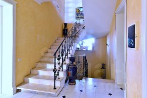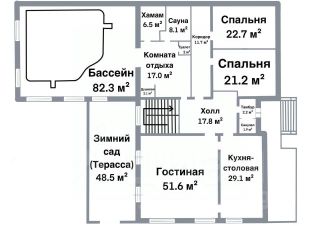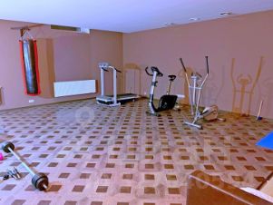 В доме 8 комнат, 6 санузлов, бассейн, хамам, финская сауна, спортзал, домашний кинотеатр, зимний сад.