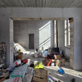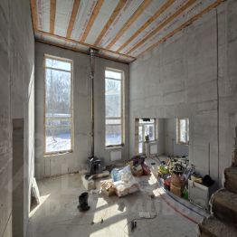 В доме сделаны все черновые работы. Стены отштукатурены можно готовить их под покраску или обои. Проштробили разетки по проекту в каждое помещение. Заведено отопление (осталось только собрать котёл) и сделана разводка на каждый радиатор. Полностью готовы фасад, крыша, окна Рехау.