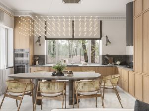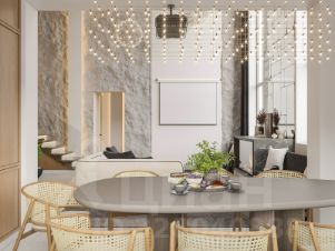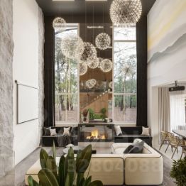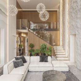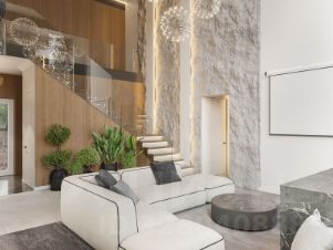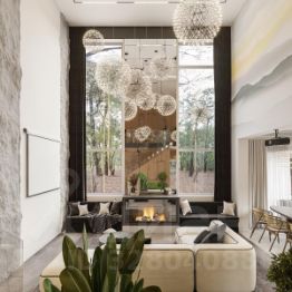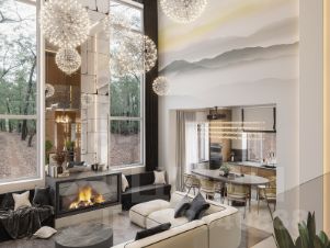 В доме предполагается просторная и роскошная гостинная с высотой потолков 7 метров, двумя панорамным окнами и камином для домашнего уюта. Четыре изолированые комнаты, три спальни и один рабочий кабинет. Три санузла, один на первом этаже, два на втором с ванными комнатами. Кухня с выходом на веранду и уютный лаундж с зоной барбекю.