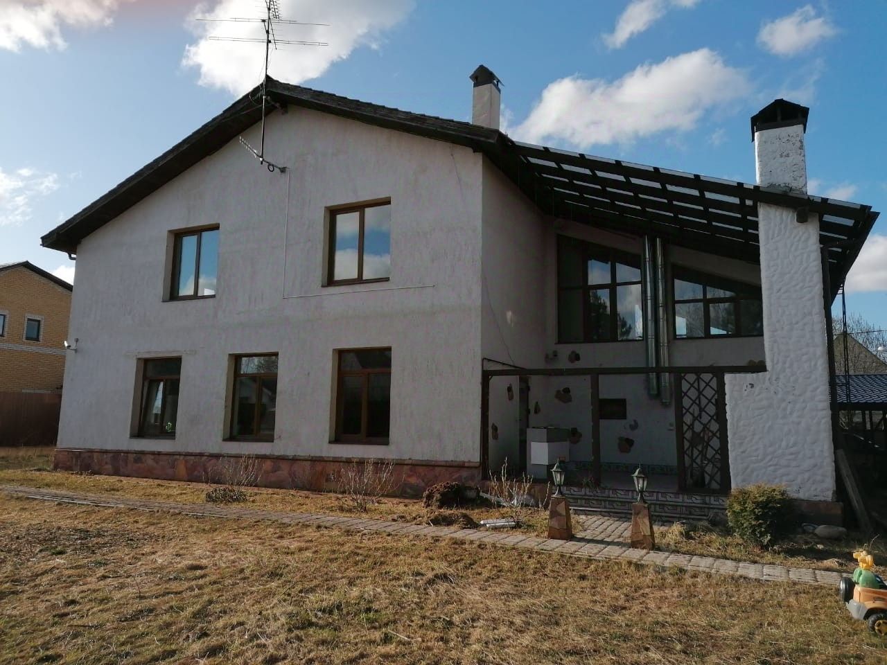 Трехэтажный дом (полуэтажами) со всеми коммуникациями имеет жилую площадь -200 кв.м, вход в дом возможен через парадный вход, гараж, зону барбекю. Оборудованы парковочные места на 2 автомобиля (навес).
