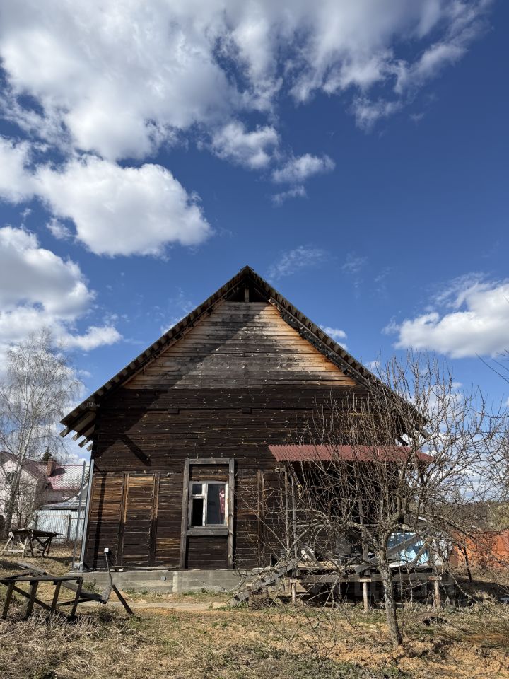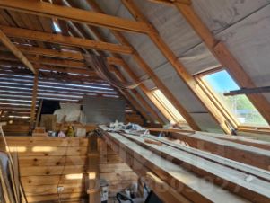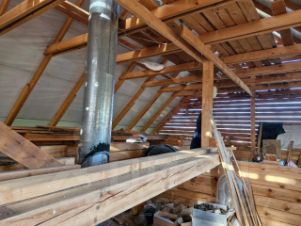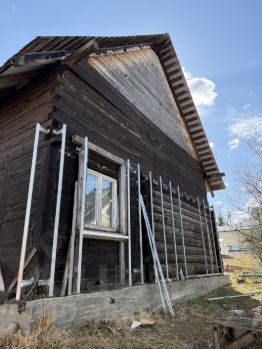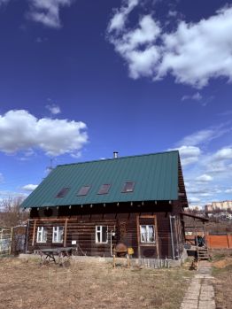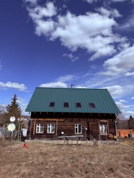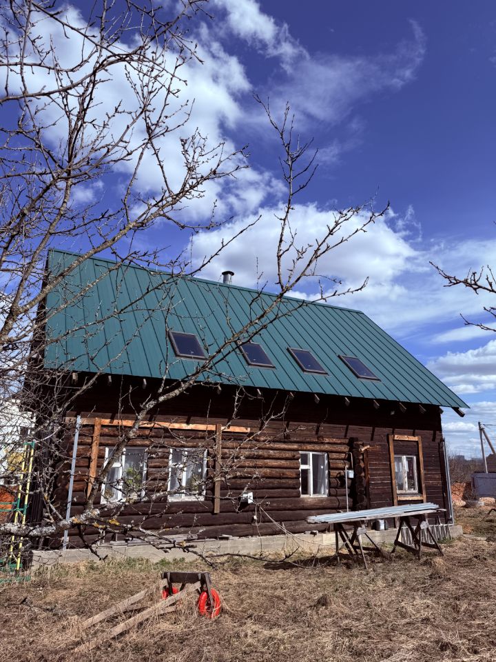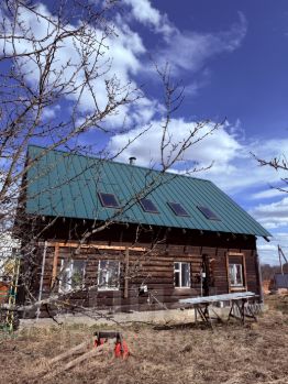 Дом изготовлен из материалов толстые бревна и брус. Крыша металлическая, есть мансардные окна.