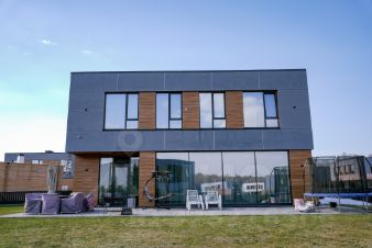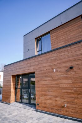 Внешняя отделка дома выполнена из премиальных панелей EQUITONE и FunderMax которые являются экологически чистым и долговечным материалом. Стены выполнены из Porotherm 44 (толщина стены 440 мм2), который применяется для строительства зданий с несущими стенами до 8 этажей без дополнительного усиления кладки.