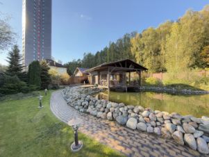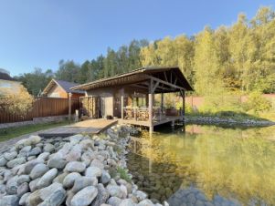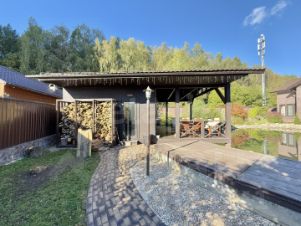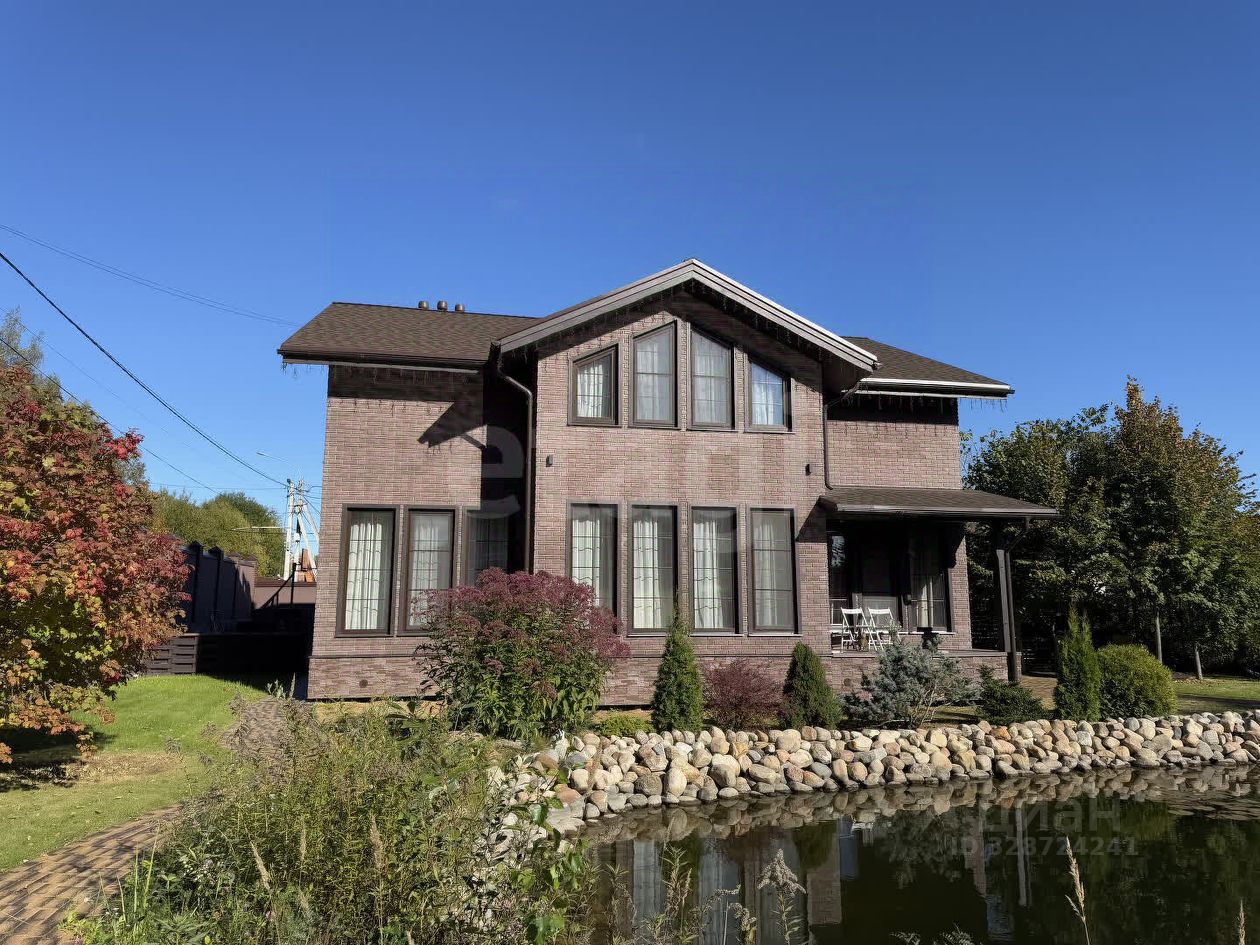 Продается просторный дом 257 м² с участком 15 соток и собственным прудом в 13 км от МКАД. На территории расположена отдельная баня 60 м² с верандой. В двухэтажном доме шесть комнат: на первом этаже кабинет, на втором — мастер-спальня с двумя гардеробными и собственной ванной. Все коммуникации централизованы: газ, электричество, водоснабжение от скважины и септик. Участок благоустроен: автоматическая подсветка, парковка, ворота Doorhan.