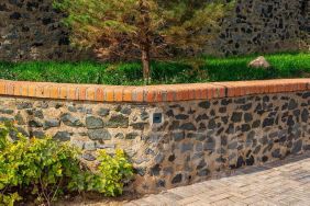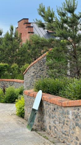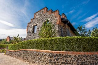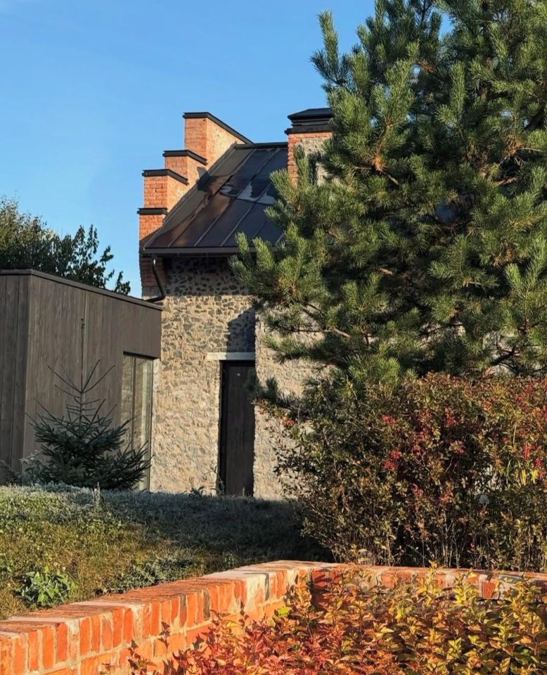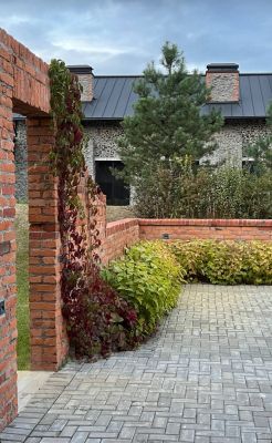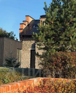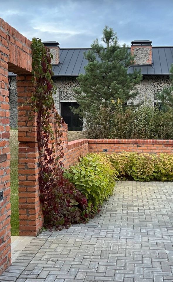 Дом расположен на участке с ландшафтным дизайном: растущими вокруг дома декоративными деревьями и кустарниками.