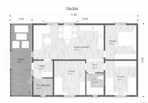 Участок ровный и огорожен забором. В доме 3 спальни, кухня-гостиная, один