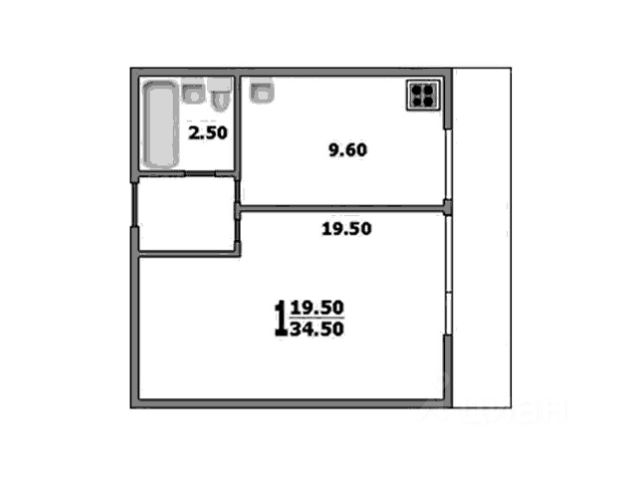 Общая площадь: 35.4 кв.м., жилая площадь: 20 кв.м., кухня: 9.8 кв.м.