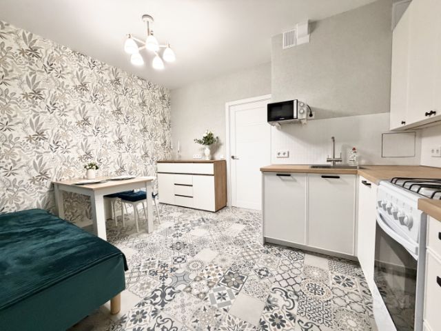 В квартире сделан дизайнерский ремонт. Окна выходят во двор, поэтому в квартире тихо и спокойно. Перед домом парковая часть, до соседних окон далеко. И то, это окна частного сектора, коттеджные дома.