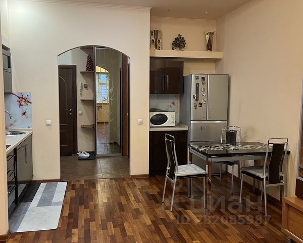 Кухня-гостиная с кухонным гарнитуром и зоной отдыха площадью 16,9 кв м. Техника: варочная панель на 3 конфорки, духовой шкаф, вытяжка, посудомоечная машина, чайник, микроволновая печь, холодильник. Есть набор посуды. Обеденный стол раскладной, к нему 6 табуреток. В зоне гостиной находятся 1,5-спальный раскладной диван и 55" телевизор с тумбой. Есть комплект спальных принадлежностей для дивана.