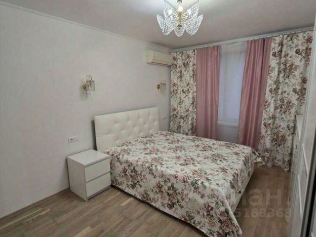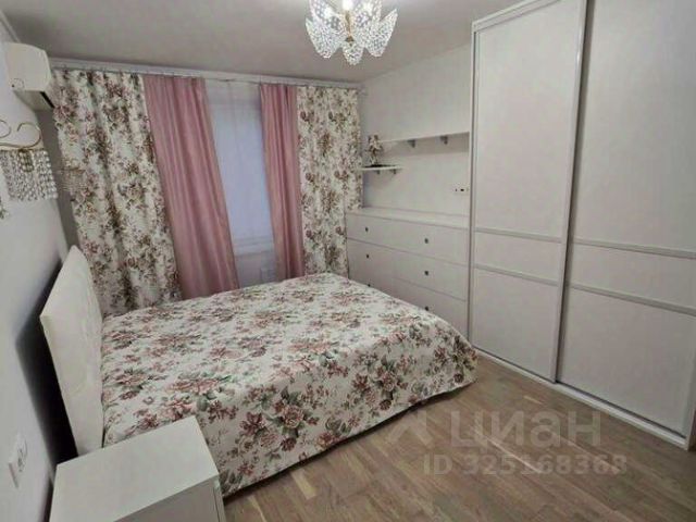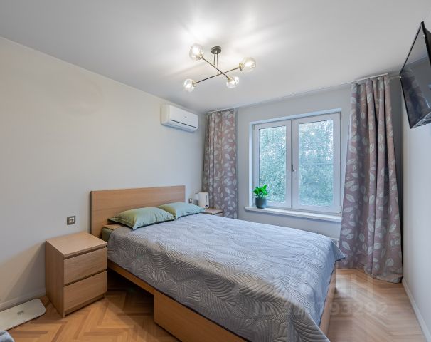 Спальная зона: Большая кровать с двусторонним матрасом Ascona, огромный встроенный шкаф, прикроватные и подвесная тумбы, телевизор Xiaomi Smart TV.