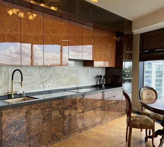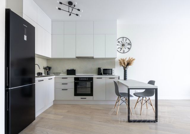 Кухня: Кухонный гарнитур от Стильные кухни с каменной столешницей. Вся встроенная техника: холодильник, посудомоечная машина, варочная панель, вытяжка, духовой шкаф с функцией СВЧ. Также есть чайник, посуда и столовые приборы. Установлен фильтр с обратным осмосом для питьевой воды. Обеденная зона с раскладным диваном MOON (спальное место 140x200), столом и стульями.
