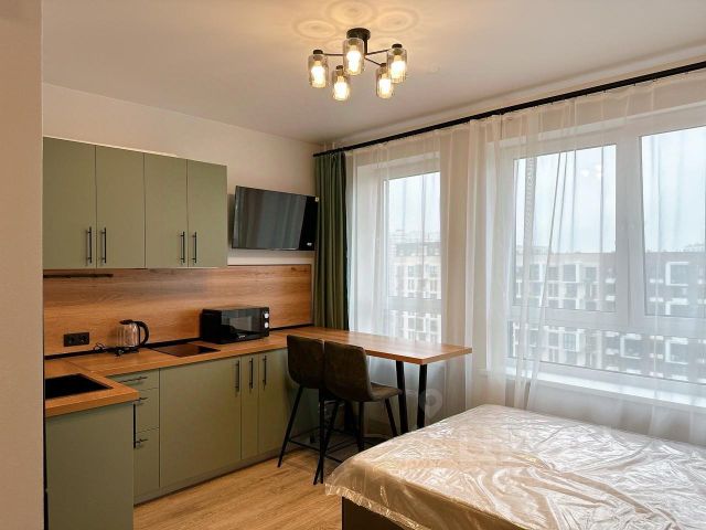 Есть все необходимое для комфортного проживания, холодильник, СВЧ печь, встроенная плита, стиральная машина, ложки, вилки, тарелки, кружки, утюг, гладильная доска, чайник. Заезжайте и живите!