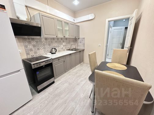 Кухня: Кухонный гарнитур, встроенная техника (холодильник, варочная панель, духовой шкаф, вытяжка), микроволновка, электрочайник.