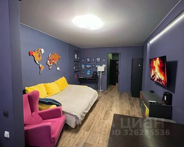 - Комната 19 кв. м. Удобный диван с надежным механизмом аккордеон, раскладывается в полноценное спальное место шириной 160 см. Обьемные шкафы для хранения и плазменный телевизор.